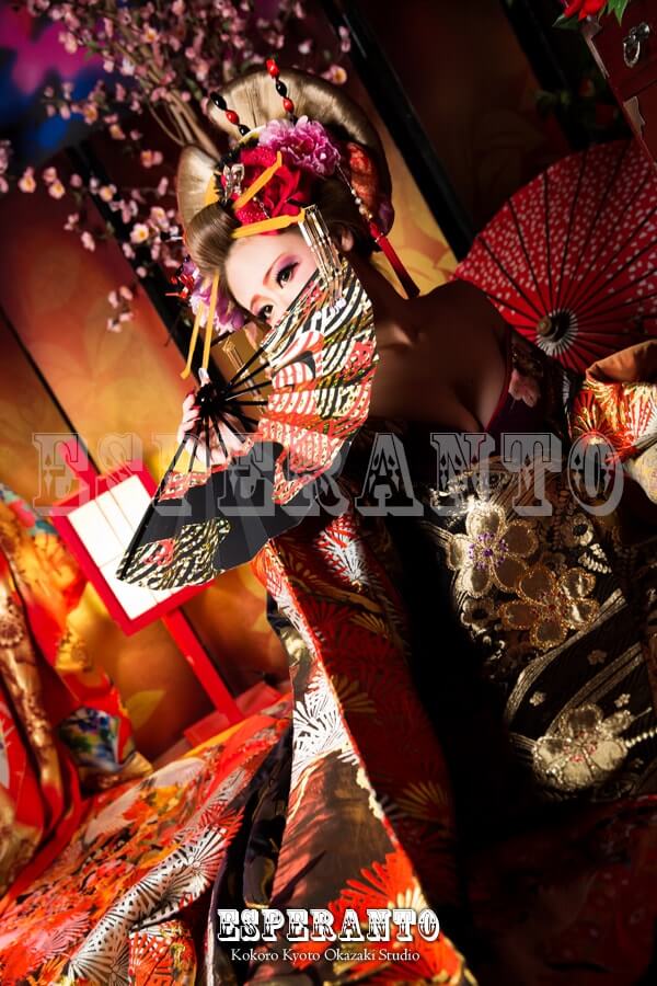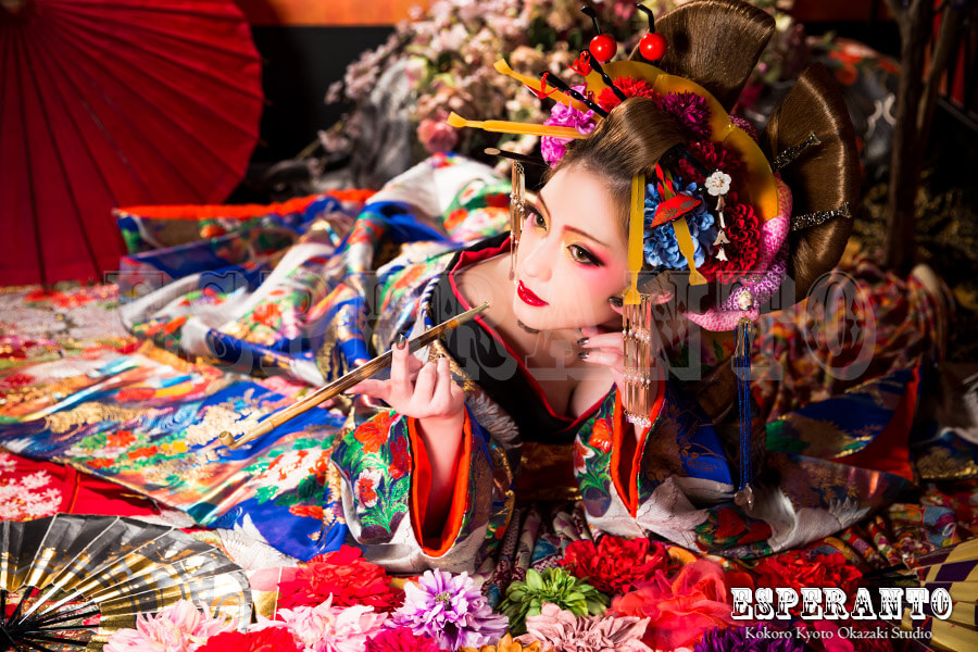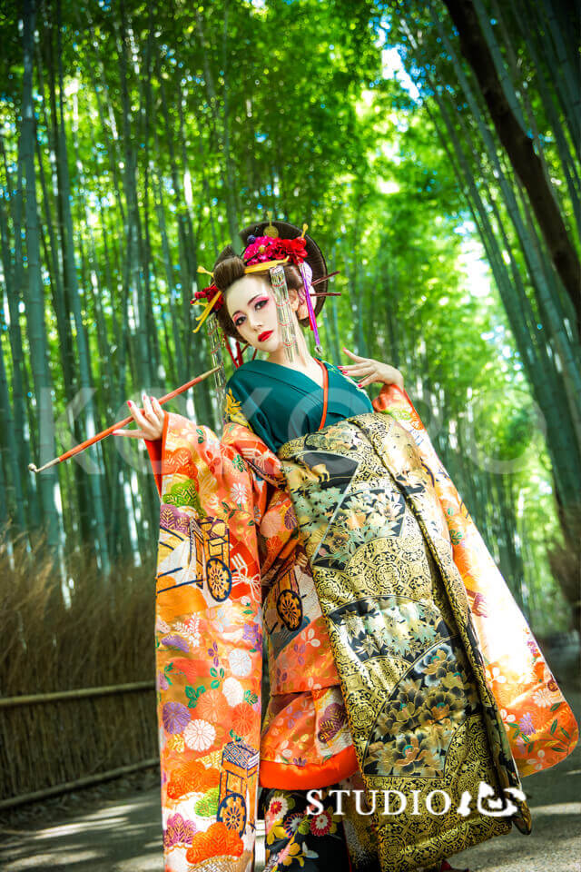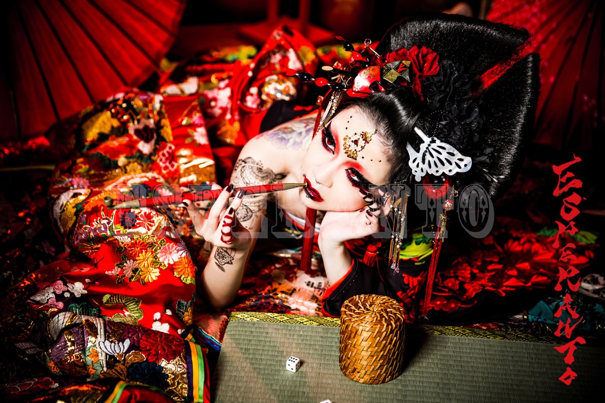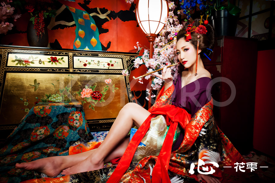 普段なかなかお着物を着る機会が少ないという方にも、簡単に、優雅で美しい花魁さんに変身して頂けるのが、花魁体験の最大の魅力です。現代メイクをして、ヘアアレンジを施し、簪を挿して、花魁さんの豪華なお着物に袖を通す。美しい花魁さんに変身したら、和傘やキセルを使ってカメラマンによるお写真撮影。普段と全く違う姿に変身して、カメラマンに写真を撮ってもらう特別な体験です。