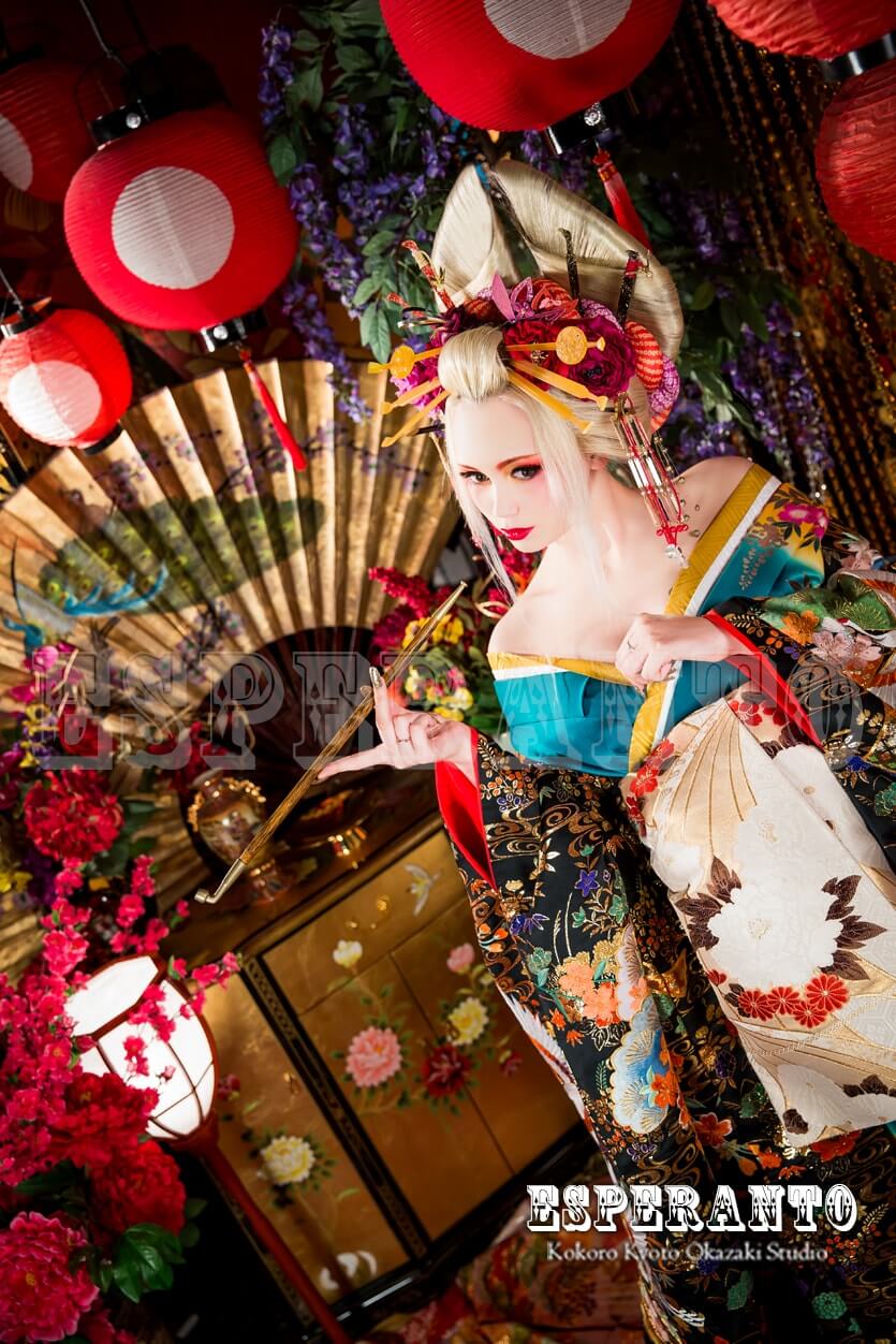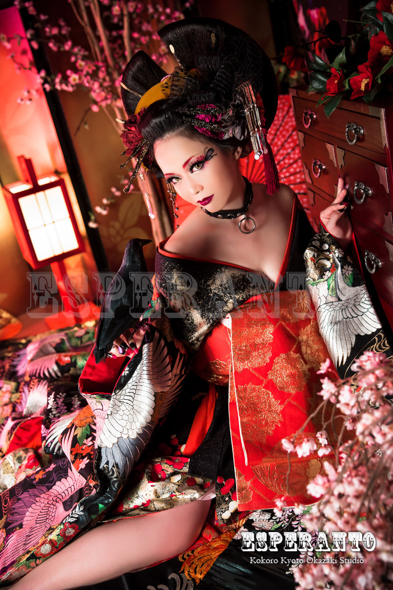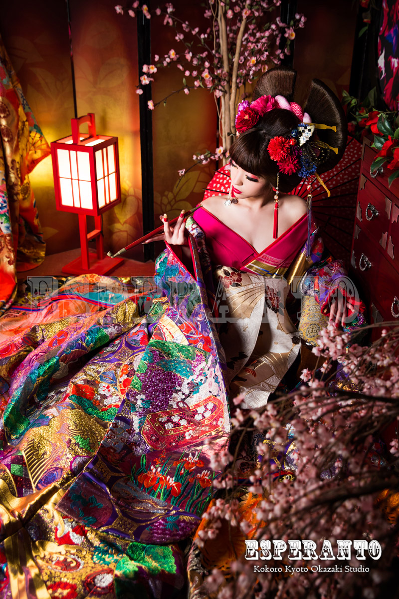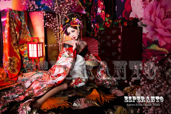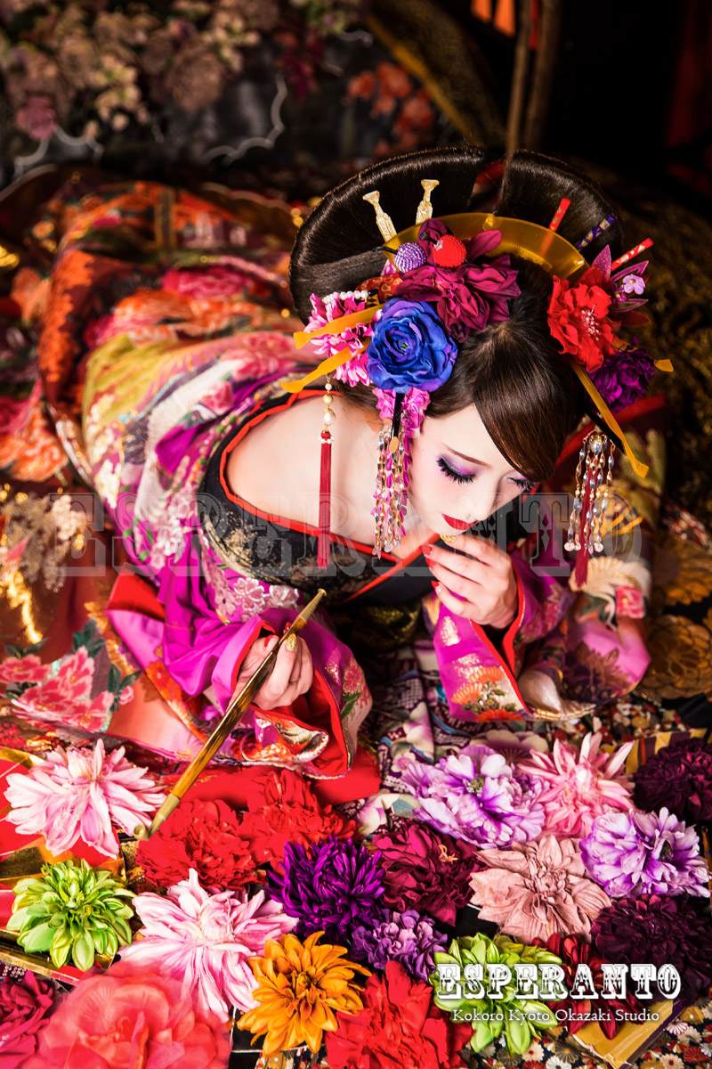 普段なかなかお着物を着る機会が少ないという方にも、簡単に、優雅で美しい花魁さんに変身して頂けるのが、花魁体験の最大の魅力です。現代メイクをして、ヘアアレンジを施し、簪を挿して、花魁さんの豪華なお着物に袖を通す。美しい花魁さんに変身したら、和傘やキセルを使ってカメラマンによるお写真撮影。普段と全く違う姿に変身して、カメラマンに写真を撮ってもらう特別な体験です。